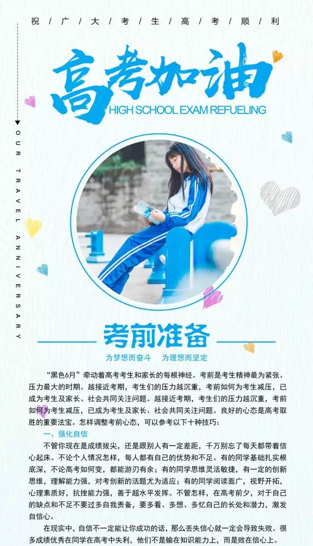 三年耕耘即將收獲,理想之花即將綻放,未來即將新的選擇,人生又有新的旅程,不要緊張,不要恐慌,放松自己,相信自己,吃好喝好,輕裝上場,好好發(fā)揮,勇奪******,祝高考順利,金榜提名。